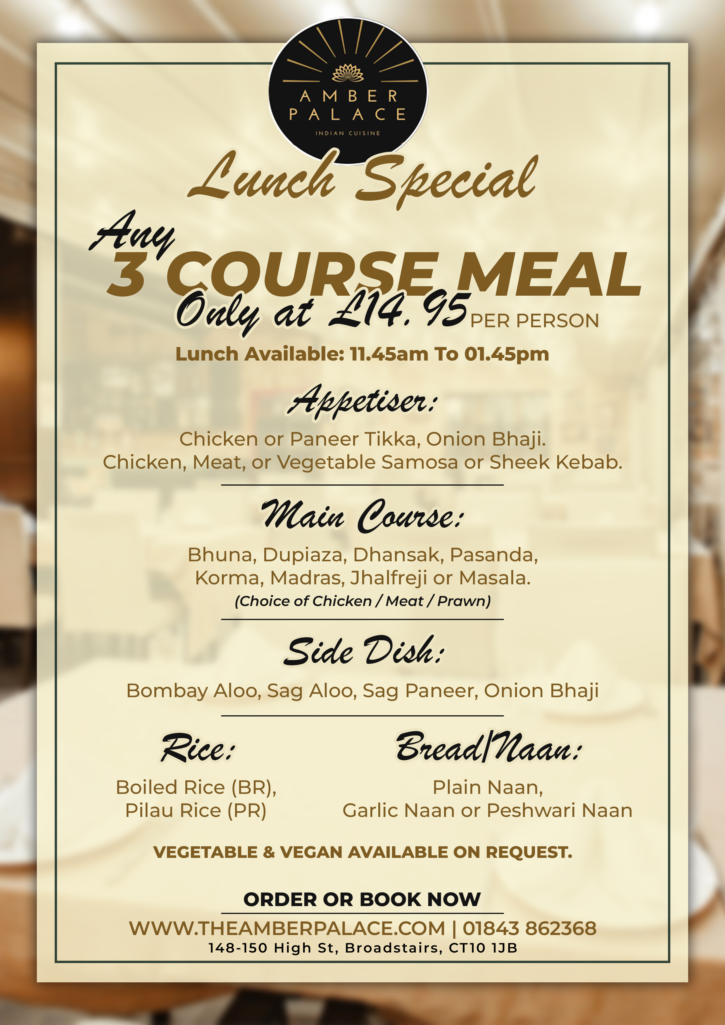 Located in Broadstairs, Amber Palace is an Indian restaurant & takeaway with a spacious dine-in area, attentive service, and prompt delivery. Our menu features a diverse range of Indian dishes, from traditional curries to house specials, with vegetarian and vegan options, offering an extensive selection under one roof. Book a table or order online today.